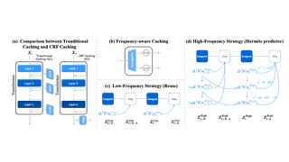 FreqCa accelerates diffusion models by analyzing frequency dynamics of features across timesteps, reusing low-frequency components and interpolating high-frequency ones with great memory reduction.